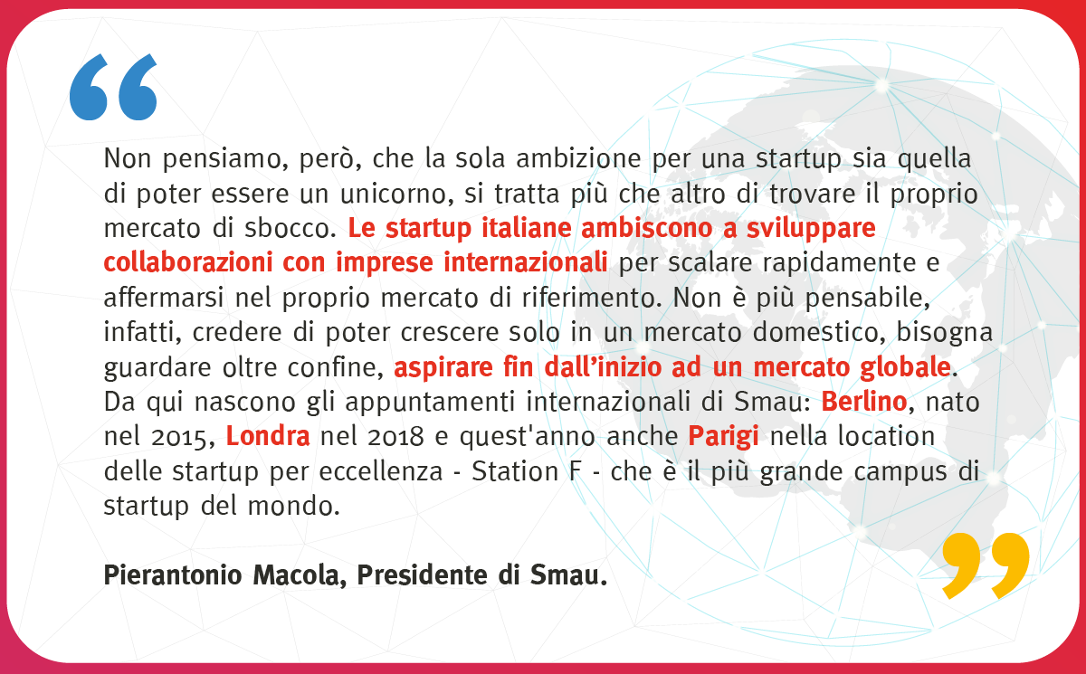 L'ecosistema Smau segue il trend e guarda con dimensione europea al futuro. Gli appuntamenti internazionali di Parigi, Berlino e Londra, organizzati in collaborazione con ITA - Italian Trade Agency, favoriranno l’incontro tra le startup e le imprese dell’ecosistema italiano con i maggiori player del mercato europeo: grandi aziende, incubatori e acceleratori, investitori e startup internazionali.