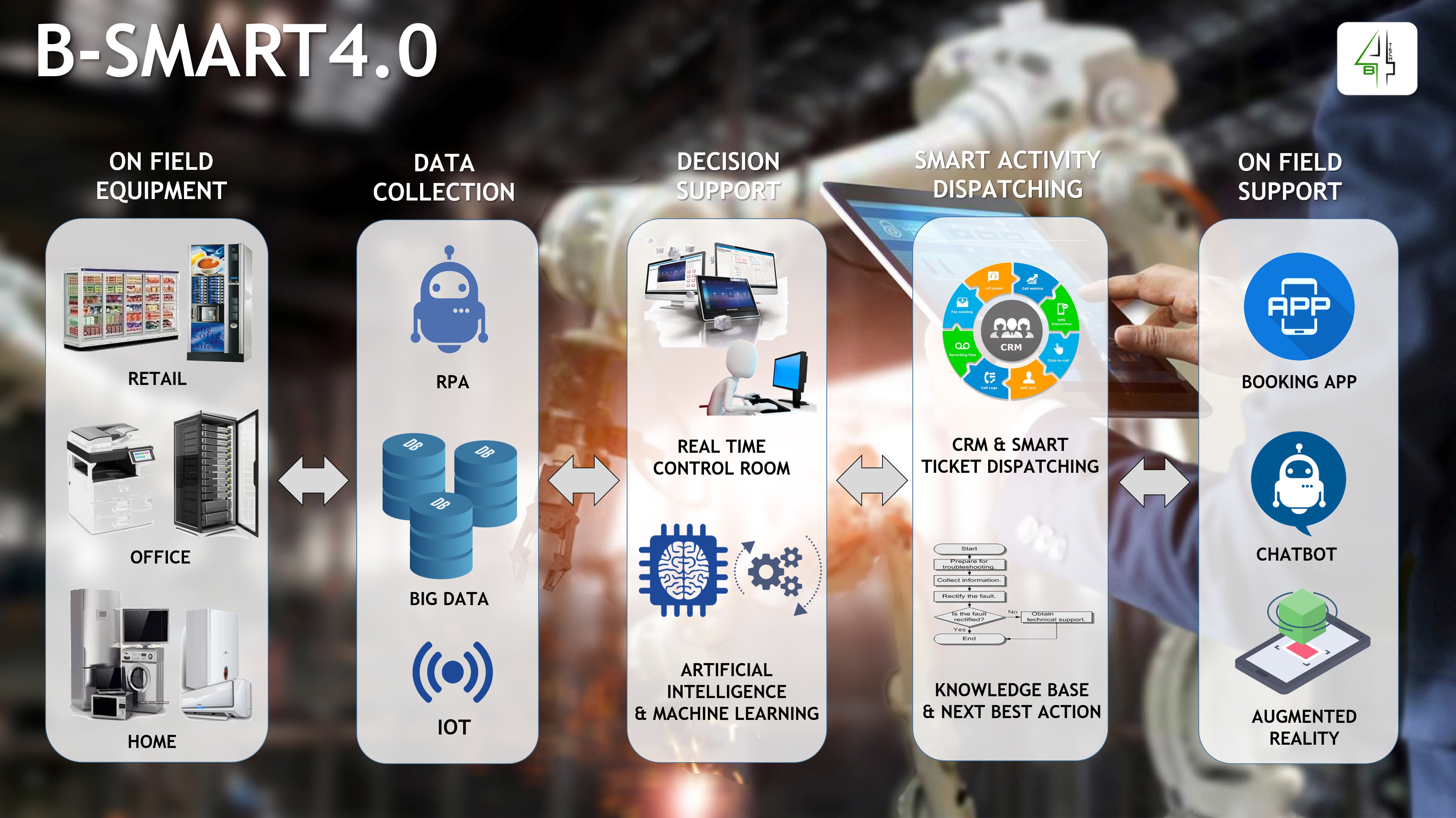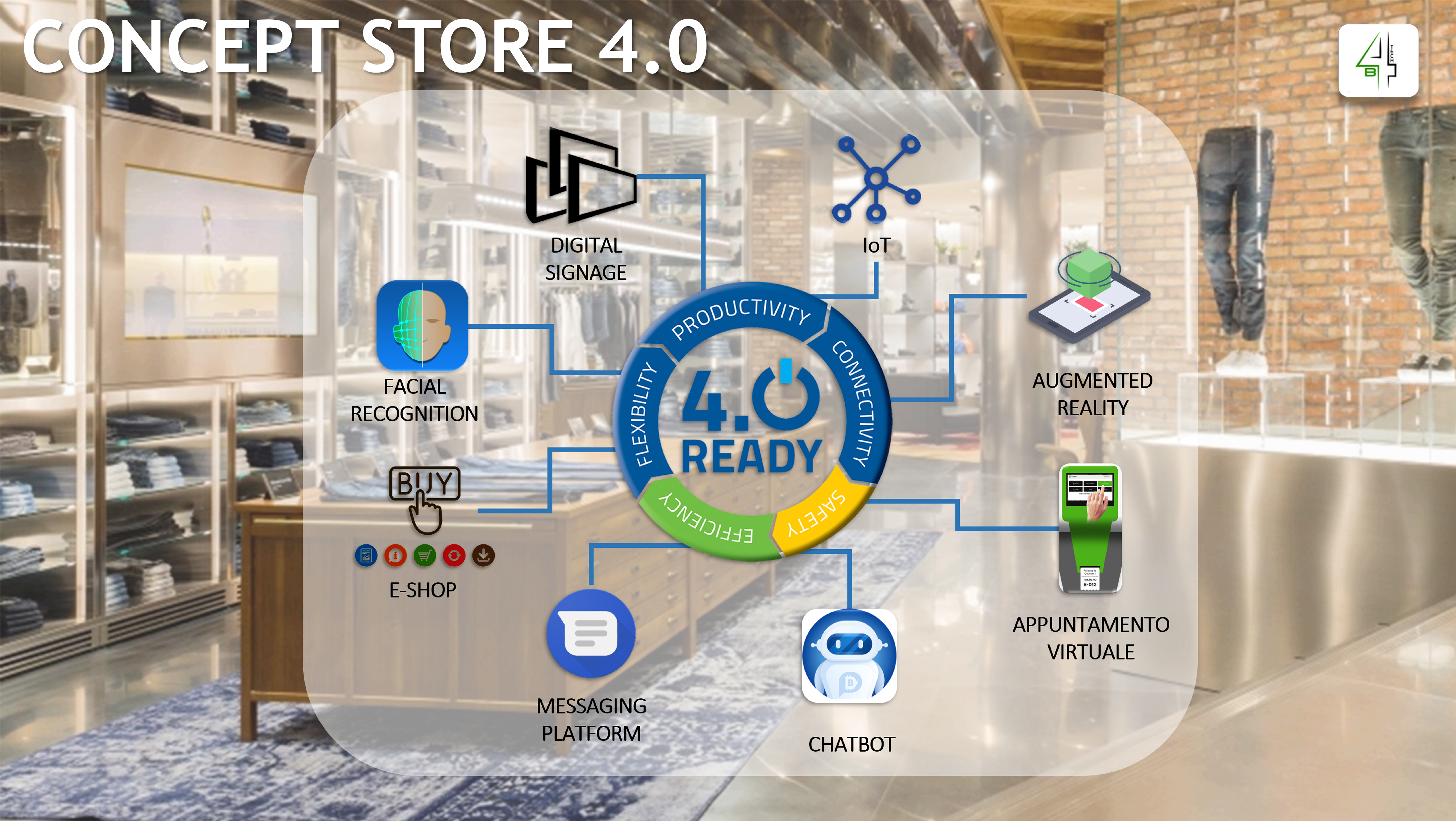 B4TECH è una Startup Innovativa che realizza Ecosistemi Digitali, basati sulle tecnologie esponenziali, al fine di portare la Digital Transformation e l’Industry 4.0 nelle realtà che operano sui mercati B2B e B2C. Gli Ecosistemi realizzati da B4TECH hanno l’obiettivo di “fare sistema”, ossia digitalizzare, automatizzare e orchestrare tutti i processi aziendali, integrandoli con le tecnologie 4.0 e mettendo sempre al centro l’organizzazione e le persone. Questo approccio consente la diminuzione degli scarti di processo, l’incremento dell’automazione di attività a basso valore e la riallocazione su attività a valore. Le aree di interesse di B4TECH sono: Industria 4.0, Retail 4.0, Fashion Tech e Digital Health.